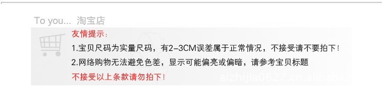 1.本店所有商品均為底價(jià)格謝絕還價(jià),同時(shí)店內(nèi)商品都是實(shí)物拍攝的,但由于每個(gè)人的顯示器不同,顏色會(huì)有所偏差,一切以實(shí)物為準(zhǔn)。買家在收到物品時(shí)不能顏色偏差之由調(diào)換產(chǎn)品。(如果一定要調(diào)換,要保證賣家有貨的情況下可以調(diào)換,不能影響賣家第2次銷售,并且要買家付雙程運(yùn)費(fèi))