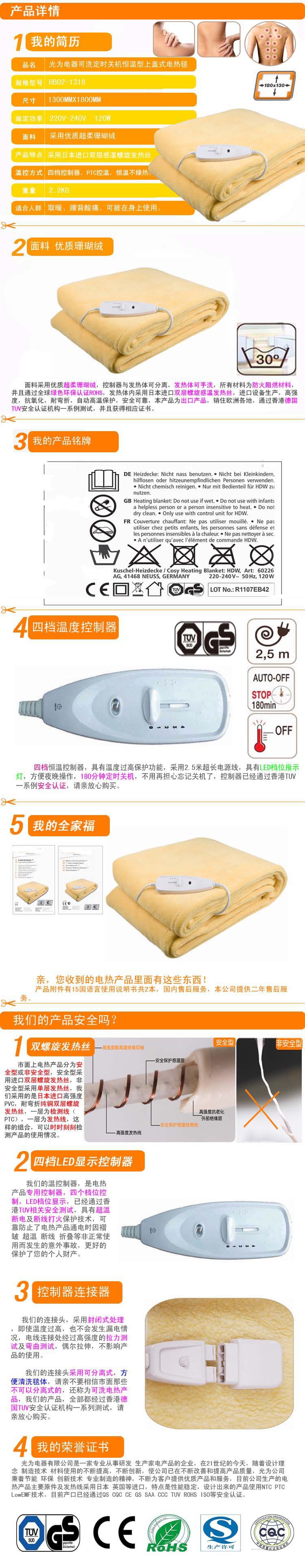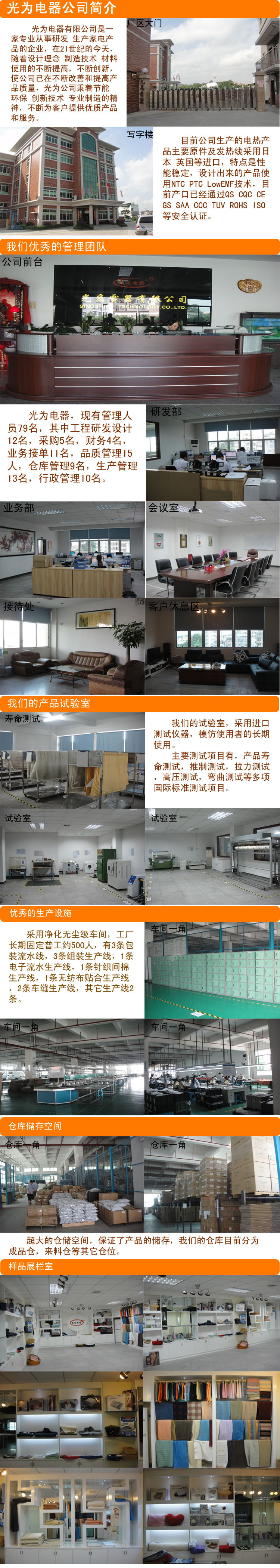 公司生產的主要產品有電熱毯,熱敷墊等。目前公司生產的電熱產品主要原件及發熱線采用日本及英國進口。特點是性能穩定,設計出來的產品使用NTC,PTC,LOWEMF技術,使產品在安全特性方面走在行業前端。目前產品已通過CE,GS,SAA,TUV 等安全認證。