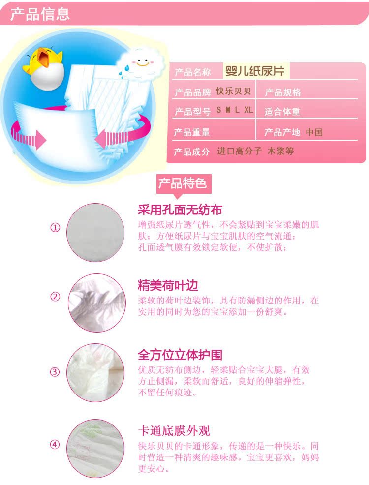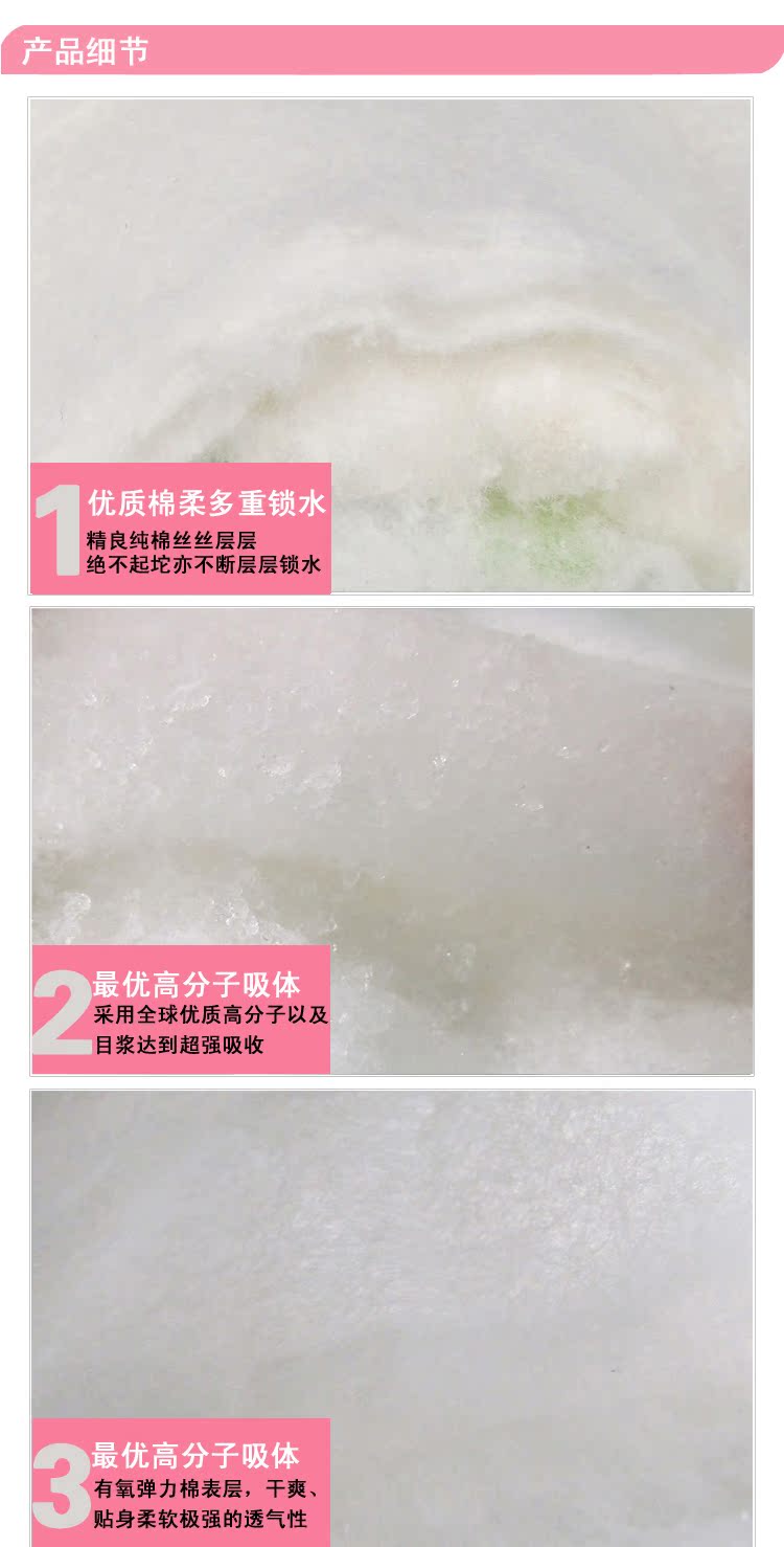 4、雙重立體護圍設計,杜絕側漏,快速導流、鎖濕絕不回滲,全方位吸水體,雙層超吸收,尿量更多也不怕,瞬間吸水超薄層,吸收更迅速