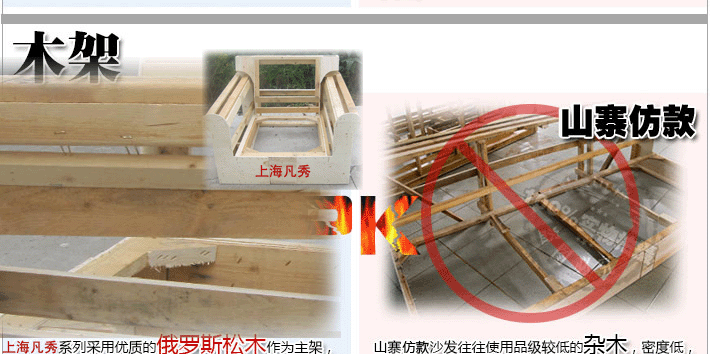 內架是采用實木和人造板材框架結構,主要工藝是對木材進行干燥,防蟲蛀,防螨蟲等特殊工藝處理,以及對每張沙發木架用量的把握,關鍵的是主要用料要有足夠承受力,每一張底架的用料都是經過技術人員的嚴格挑選,而且沙發架關鍵部位(例如:扶手)的制作不僅要經過特殊加固,更要由工作經驗豐富的技術人員親自操作。座面和背面的結構是采用蛇簧或強力橡筋帶及高密度海綿。