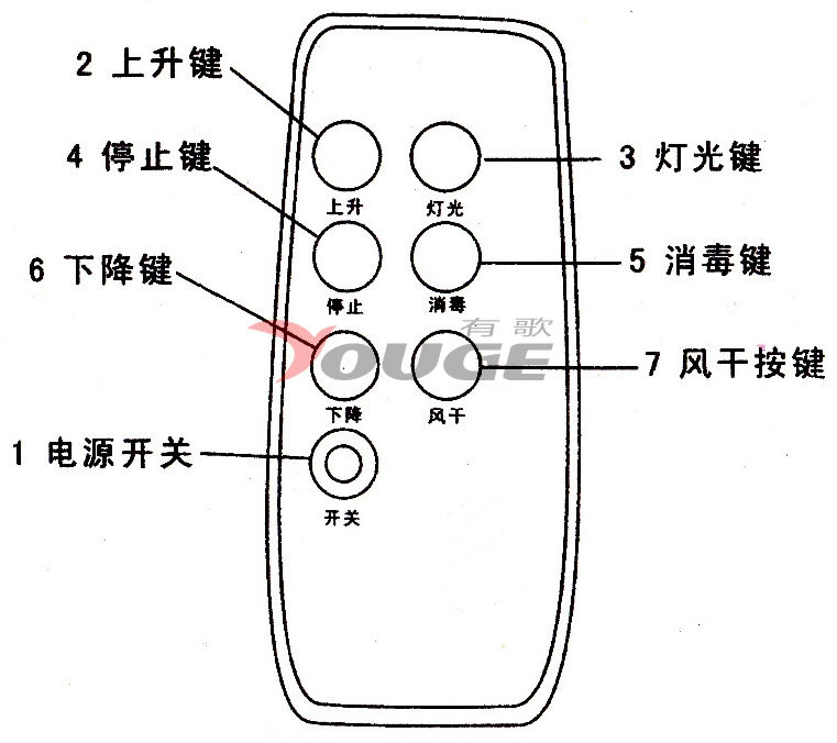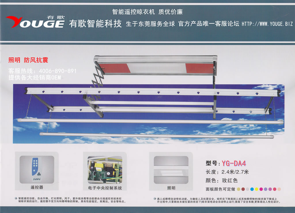 如:YG-DB4ZFS,YG-表示有歌,D-表示電動晾衣架,B-代表版本(現(xiàn)在經(jīng)過升級,順利由A版本變更到B版本),4-代表?xiàng)U數(shù)量,Z-表示具備照明功能(本公司全系列電動晾衣架均具備照明功能),F(xiàn)-表示具備風(fēng)干功能,S-表示具備紫外線殺菌功能。
