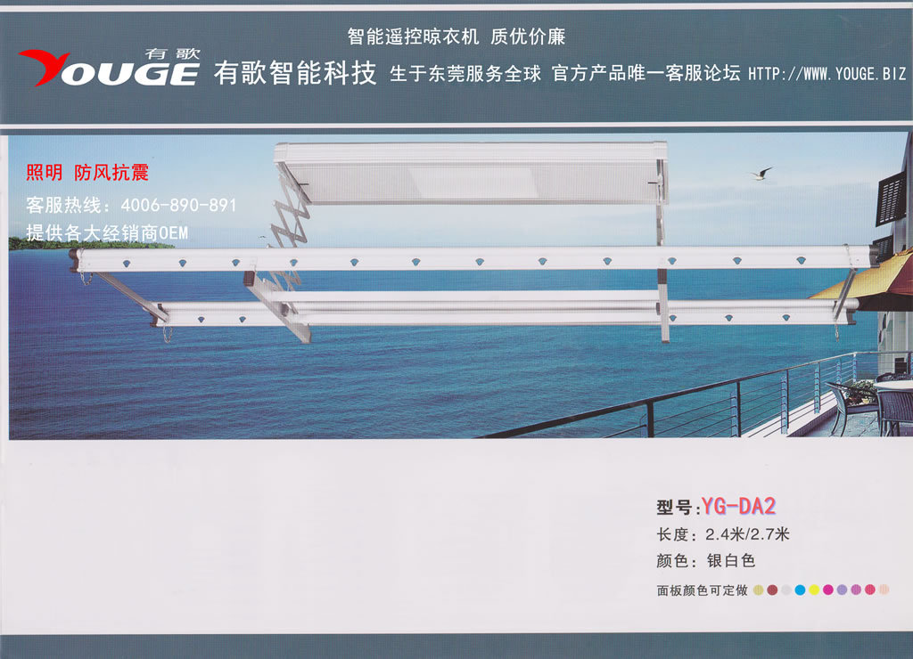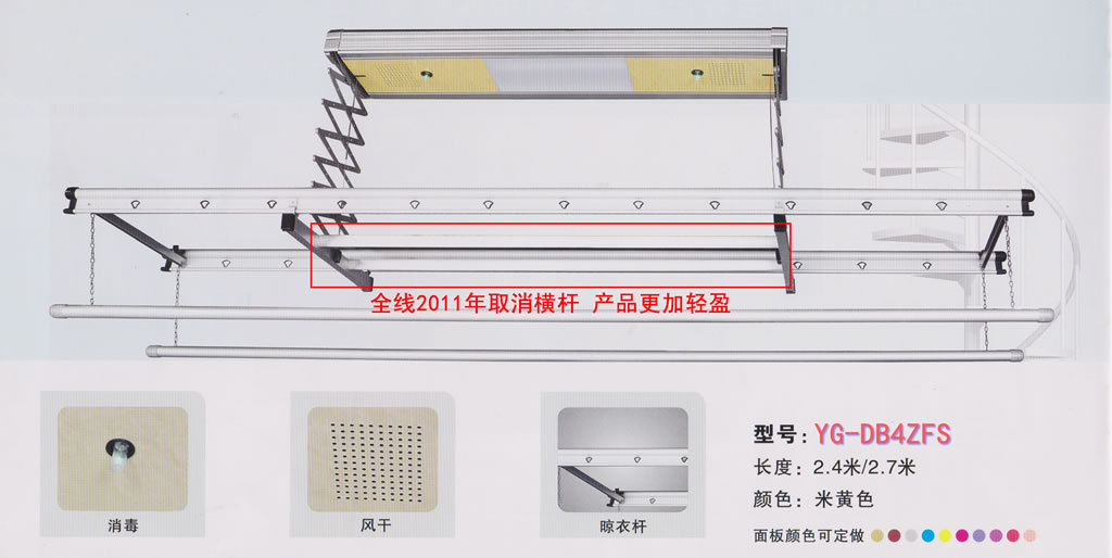 >2012年12月,我們緊接著對客人顏色的需求重新進(jìn)行高溫烤漆,推出了繽紛系列電動晾衣架(型號:YG-DB2ZFS),歡迎客戶選擇,多款,如下圖: