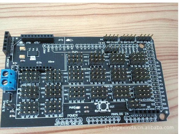 Arduino MEGA Sensor Shield V1.0專用傳感器擴展板集市面上各種擴展板優點于一體所設計,采用PCB沉金工藝加工,主板不僅將全部數字與模擬接口以舵機線序形式擴展出來,還特設藍牙模塊通信接口、SD卡模塊通信接口、APC220無線射頻模塊通信接口、以及RB URF v1.1超聲波傳感器接口,獨立擴出更加易用方便。對于Arduino初學者來說,不必為繁瑣復雜電路連線而頭疼了,這款傳感器擴展板真正意義上的將電路簡化,能夠很容易地將常用傳感器連接起來,一款傳感器僅需要一種通用3P傳感器連接線(不分數字連接線與模擬連接線),完成電路連接后,編寫相應的Arduino程序下載到Arduino MEGA控制器中讀取傳感器數據、或者接收無線模塊回傳數據,經過運算處理,終輕松完成你自己的互動作品。