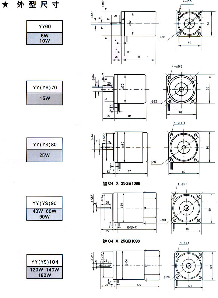 YY(YS)系列異步電動機性能優良,節能省電,結構可靠,通用性強。可作為小型機床、醫療器械、家用電器、食品加工等機械的動力裝置。根據需要可采用鑄鋁機殼或貯鐵機殼。冷卻方式為IC411、在海拔不超過1000米的條件下,能額定運行。系列電動機額定電壓為380/220V,額定頻率為50HZ。根據用戶需要可擔供230V、240V、400V、420V、575V、60HZ等電動機。