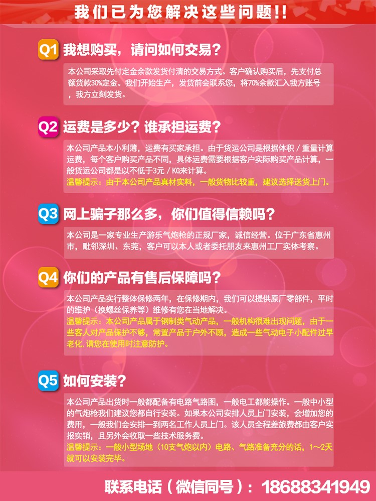 惠州軍博游樂設備有限公司是一家集研發、生產、銷售、經營管理游樂氣炮和開發創建大型射擊游樂場的專業廠家。歡迎各旅游景點、游樂場、公園、度假村、商場經營者、有投資軍事射擊主題樂園的意愿者來電、來廠洽談。