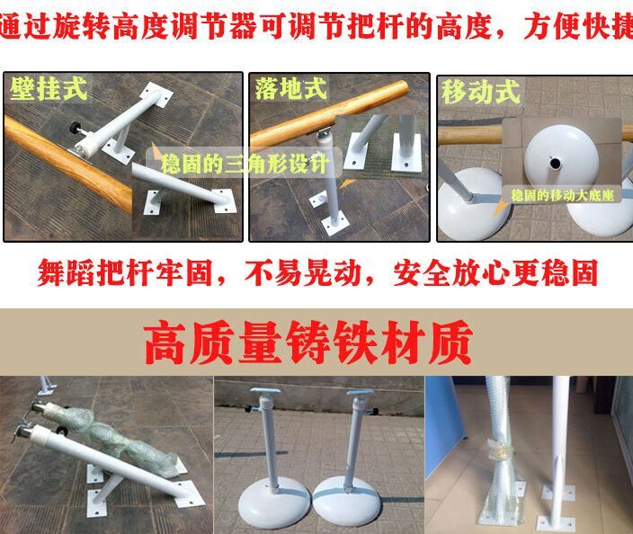 舞蹈把桿的安裝分為,移動式安裝,和固定式安裝。移動式安裝需要活動的底座支架,按重量常有25 公斤,和20公斤的。