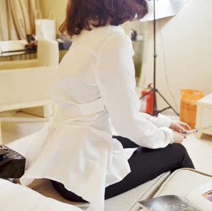 2015春韓國東大門代購寬松bf風中長款V領白襯衫長袖顯瘦女士襯衣銷量4113